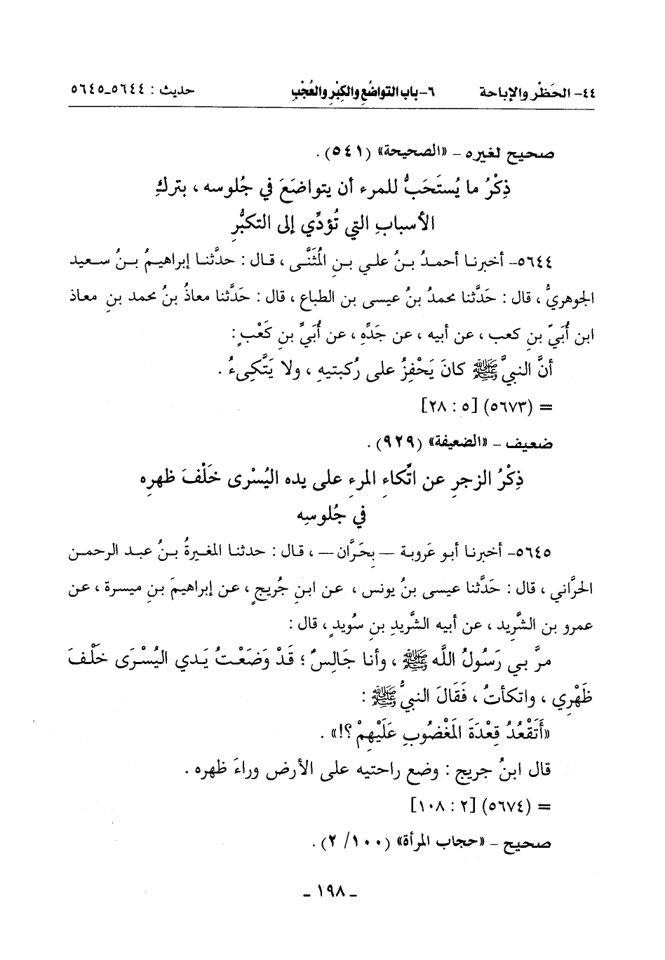 ذِكْرُ مَا يُستحب لِلْمَرْءِ أَنْ يَتَوَاضَعَ فِي جُلُوسِهِ بِتَرْكِ الْأَسْبَابِ الَّتِي تُؤَدِّي إِلَى التَّكَبُّرِ