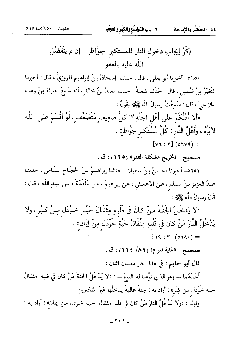 أَحَدُهُمَا ـ وَهُوَ الَّذِي نوَّعنا لَهُ النَّوْعَ ـ: ((لَا يَدْخُلُ الْجَنَّةَ مَنْ كَانَ فِي قَلْبِهِ مِثْقَالُ حَبَّةِ خَرْدَلٍ مِنْ كِبْرٍ))؛ أَرَادَ بِهِ: جَنَّةً عَالِيَةً يدخلُها غَيْرُ الْمُتَكَبِّرِينَ.