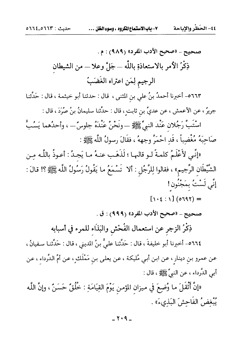 ((إِنَّ أَثْقَلَ مَا وُضِعَ فِي مِيزَانِ الْمُؤْمِنِ يَوْمَ الْقِيَامَةِ: خُلُقٌ حَسَنٌ , وَإِنَّ اللَّهَ يُبْغِضُ الفاحش البذيء)) -[210]-