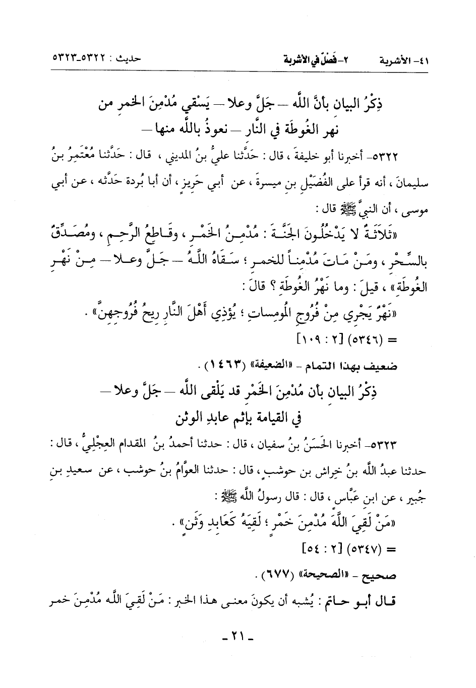 قَالَ أَبُو حَاتِمٍ: يُشْبِهُ أَنْ يَكُونَ مَعْنَى هَذَا الْخَبَرِ: مَنْ لَقِيَ اللَّهَ مُدْمِنَ خَمْرٍ -[22]- مُسْتَحِلًّا لَشُرْبِهِ - لَقِيَهُ كَعَابِدِ وَثَنٍ؛ لِاسْتِوَائِهِمَا فِي حالة الكفر.