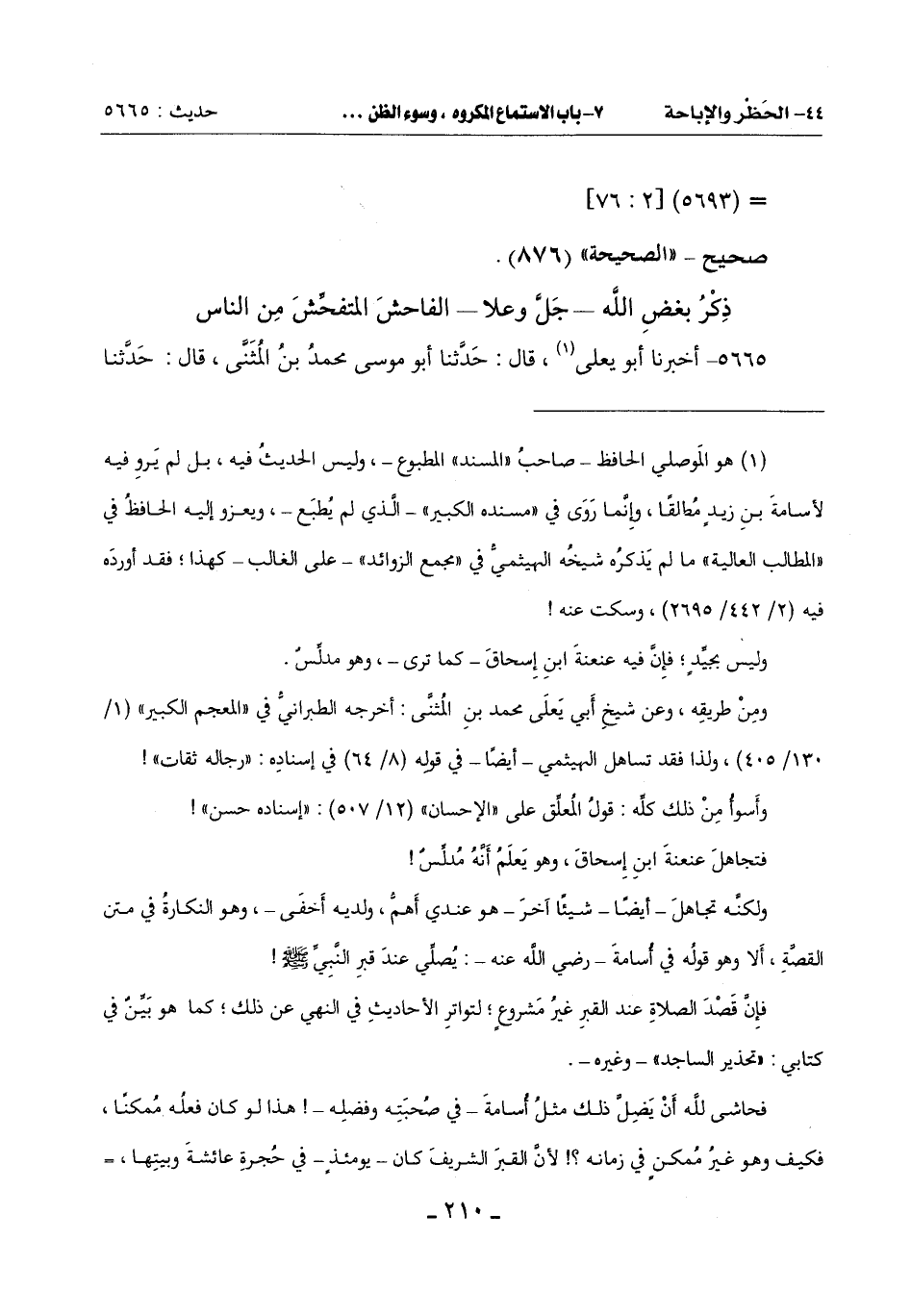 (¬1) هو الموصلي الحافظ - صاحب ((المسند)) المطبوع - , وليس الحديث فيه , بل لم يَروِ فيه لأسامة بن زيد مطلقاً , وإنما روى في ((مسنده الكبير)) - الذي لم يُطبَع - , ويعزو إليه الحافظ في ((المطالب العالية)) ما لم يَذكرُه شيخه الهيثمي في ((مجمع الزوائد)) - على الغالب - كهذا؛ فقد أورده فيه (2/ 442/2695) , وسكت عنه!