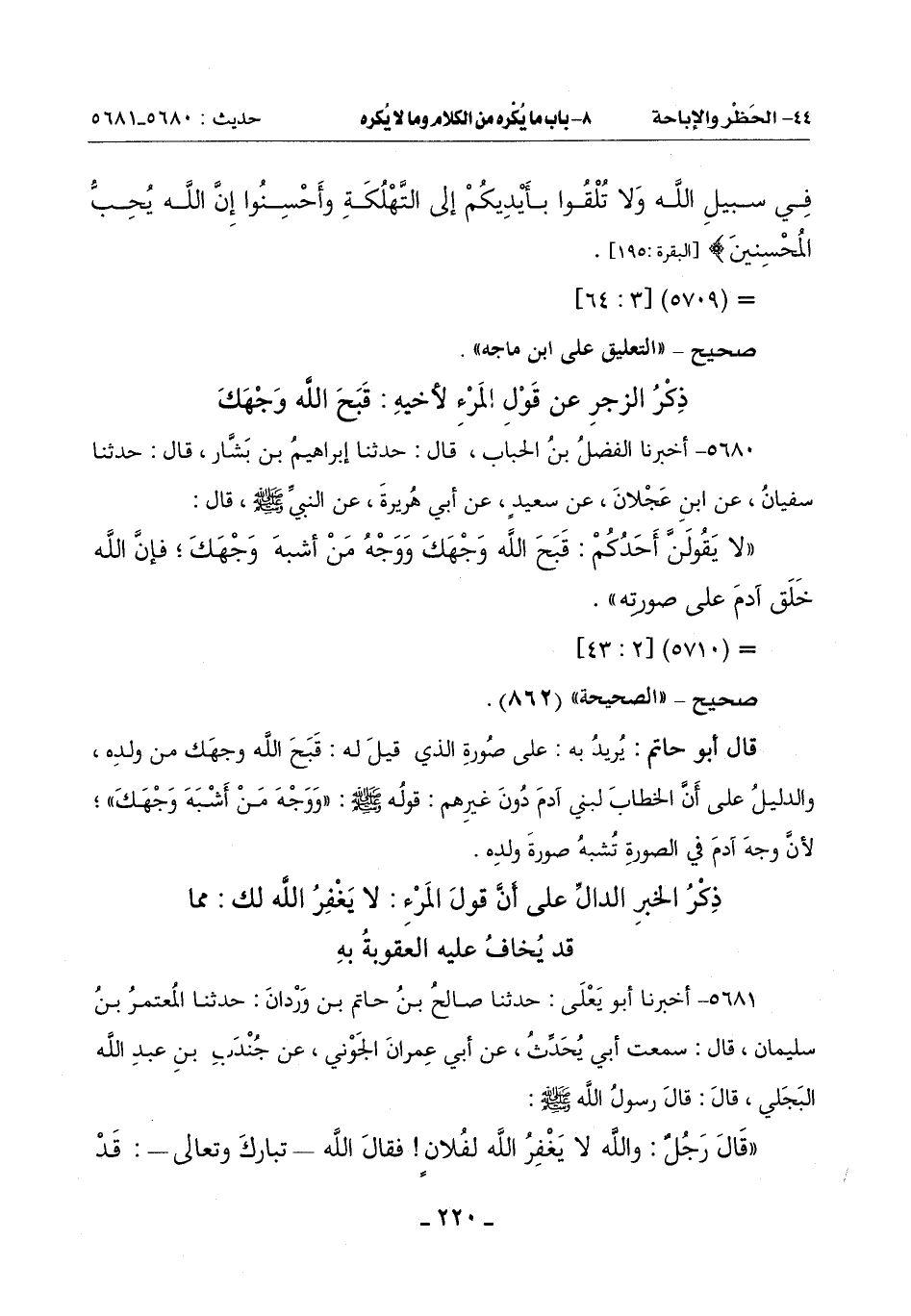 قَالَ أَبُو حَاتِمٍ: يُريد بِهِ: عَلَى صُورَةِ الَّذِي قِيلَ لَهُ: قَبَّحَ اللَّهُ وَجْهَكَ مِنْ وَلَدِهِ , وَالدَّلِيلُ عَلَى أَنَّ الْخَطَّابَ لِبَنِي آدَمَ دُونَ غَيْرِهِمْ: قَوْلُهُ صَلَّى اللَّهُ عَلَيْهِ وَسَلَّمَ: ((وَوَجْهَ مَنْ أَشْبَهَ وَجْهَكَ))؛ لِأَنَّ وَجْهَ آدَمَ فِي الصُّورَةِ تُشبه صُورَةَ وَلَدِهِ.