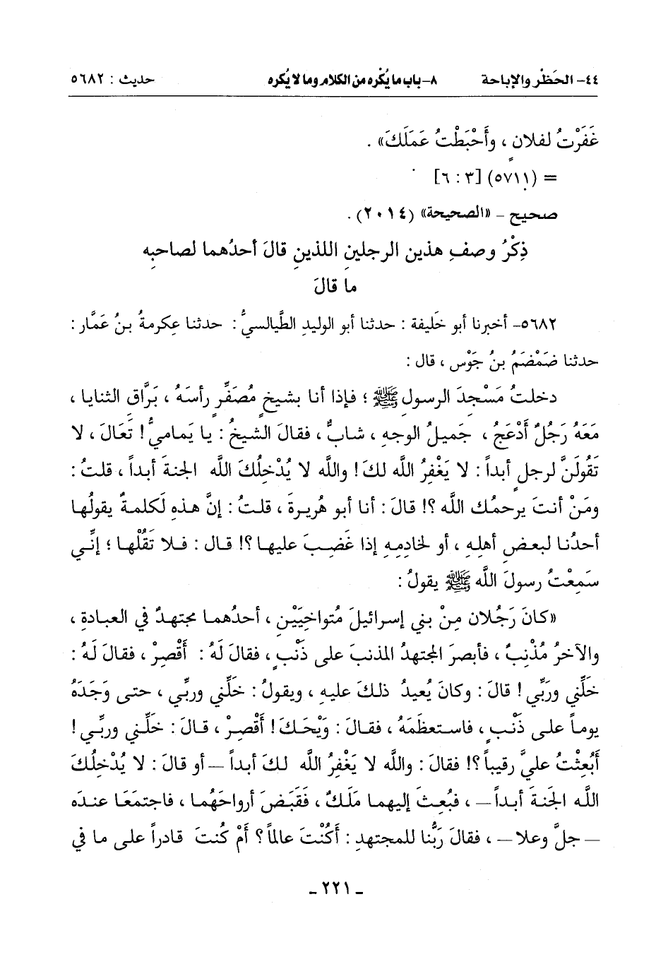 ((كَانَ رَجُلَانِ مِنْ بَنِي إِسْرَائِيلَ مُتواخِيَيْنِ , أَحَدُهُمَا مُجْتَهِدٌ فِي الْعِبَادَةِ , والآخرُ مُذْنِبٌ , فَأَبْصَرَ المجتهدُ المذنبَ عَلَى ذَنْبٍ , فَقَالَ لَهُ: أَقْصِرْ , فَقَالَ لَهُ: خَلِّني وَرَبِّي! قَالَ: وَكَانَ يُعيد ذَلِكَ عَلَيْهِ , وَيَقُولُ: خَلِّني وَرَبِّي , حَتَّى وَجَدَهُ يَوْمًا عَلَى ذَنْبٍ , فاستعظَمَهُ , فَقَالَ: وَيْحَكَ! أَقْصِرْ , قَالَ خَلِّنِي وَرَبِّي! أَبُعِثْتَ عَلَيَّ رَقِيبًا؟! فَقَالَ: وَاللَّهِ لَا يَغْفِرُ لَكَ أَبَدًا - أَوْ قَالَ: لَا يُدْخِلُكَ اللَّهُ الْجَنَّةَ أَبَدًا - , فبُعِثَ إِلَيْهِمَا مَلَكٌ , فَقَبَضَ أَرْوَاحَهُمَا , فَاجْتَمَعَا عِنْدَهُ - جَلَّ وَعَلَا - , فَقَالَ رَبُّنَا لِلْمُجْتَهِدِ: أَكُنْتَ عَالِمًا؟ أَمْ كُنْتَ قَادِرًا عَلَى مَا فِي -[222]- يَدِي؟ أَمْ تَحْظُرُ رَحْمَتِي عَلَى عَبْدِي؟! اذْهَبْ إِلَى الْجَنَّةِ - يُرِيدُ: الْمُذْنِبَ - , وَقَالَ لِلْآخَرِ: اذْهَبُوا بِهِ إِلَى النَّارِ.
