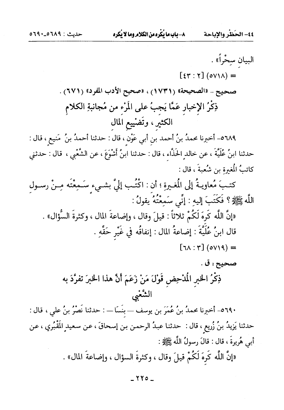 ((إِنَّ اللَّهَ كَرِهَ لَكُمْ قِيلَ وَقَالَ , وكثرة السؤال , وإضاعة المال)). -[226]-