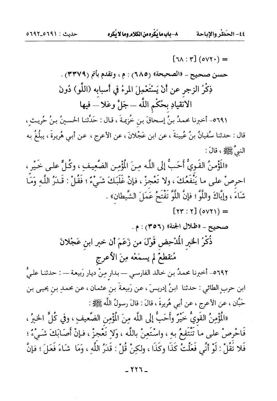 ذِكْرُ الزَّجْرِ عَنْ أَنْ يَسْتَعْمِلَ الْمَرْءُ فِي أَسْبَابِهِ (اللَّو) دُونَ الِانْقِيَادِ بِحُكْمِ اللَّهِ جَلَّ وعلا فيها