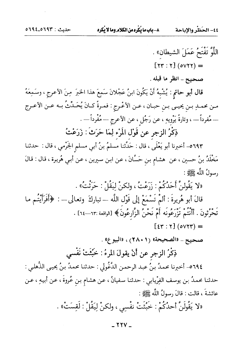 ((لا يَقُولَنَّ أَحَدُكُمْ: خَبُثَتْ نَفْسِي , وَلَكِنْ لِيَقُلْ: لَقِسَتْ)). -[228]-