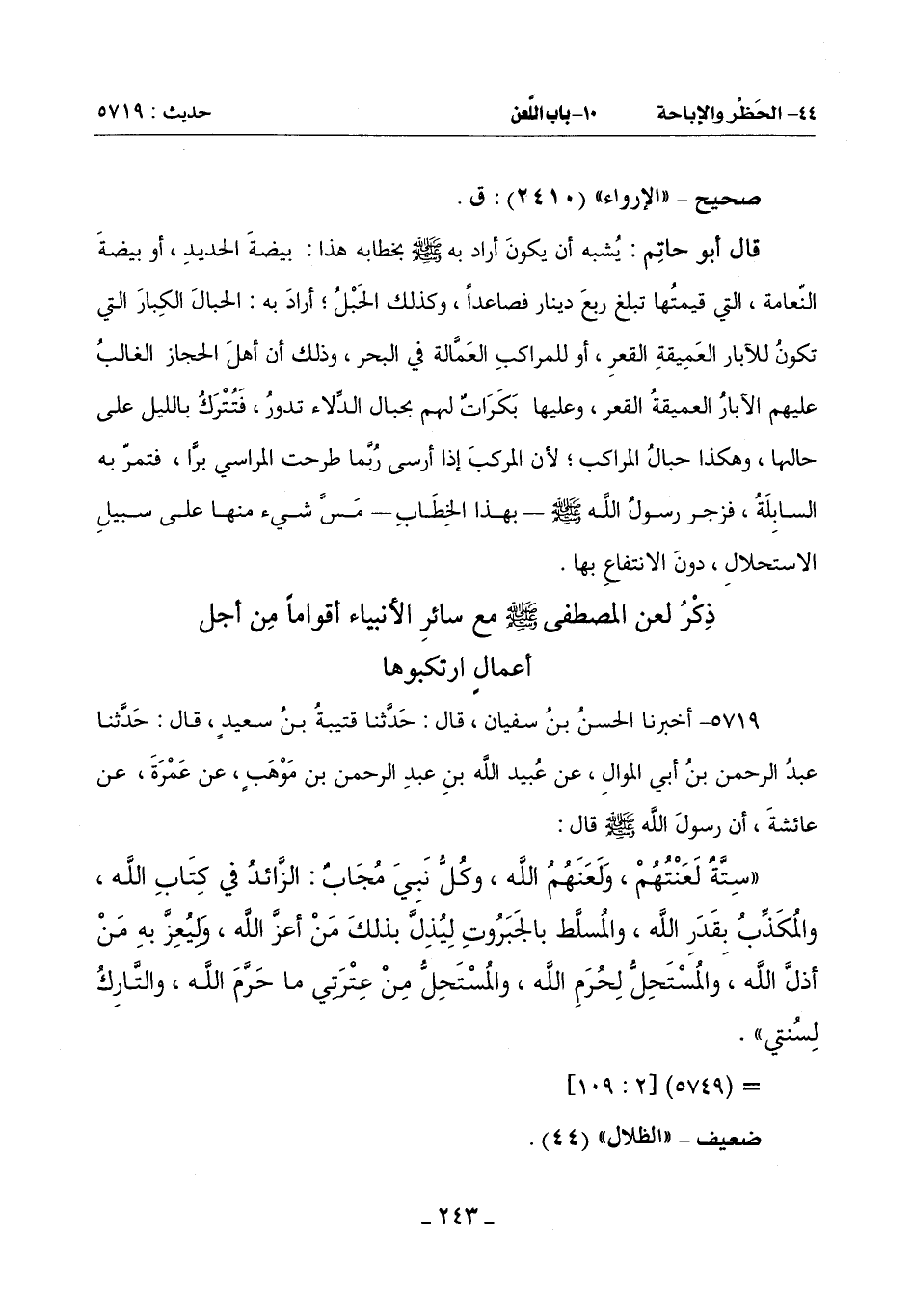 ((سِتَّةٌ لَعَنْتُهُمْ , وَلَعَنَهُمُ اللَّهُ , وَكُلُّ نَبِيٍّ مُجَابٌ: الزَّائِدُ فِي كِتَابِ اللَّهِ , والمُكَذِّبُ بِقَدَرِ اللَّهِ , والمُسلَّط بِالْجَبَرُوتِ لِيُذِلَّ بِذَلِكَ مَنْ أَعَزَّ اللَّهُ , وَلِيُعِزَّ بِهِ مَنْ أَذَلَّ اللَّهُ, والمُسْتَحِلُّ لِحُرَمِ اللَّهِ , والمُسْتَحِلُّ مِن عِتْرَتي مَا حَرَّمَ الله , والتارك لِسُنتي)).