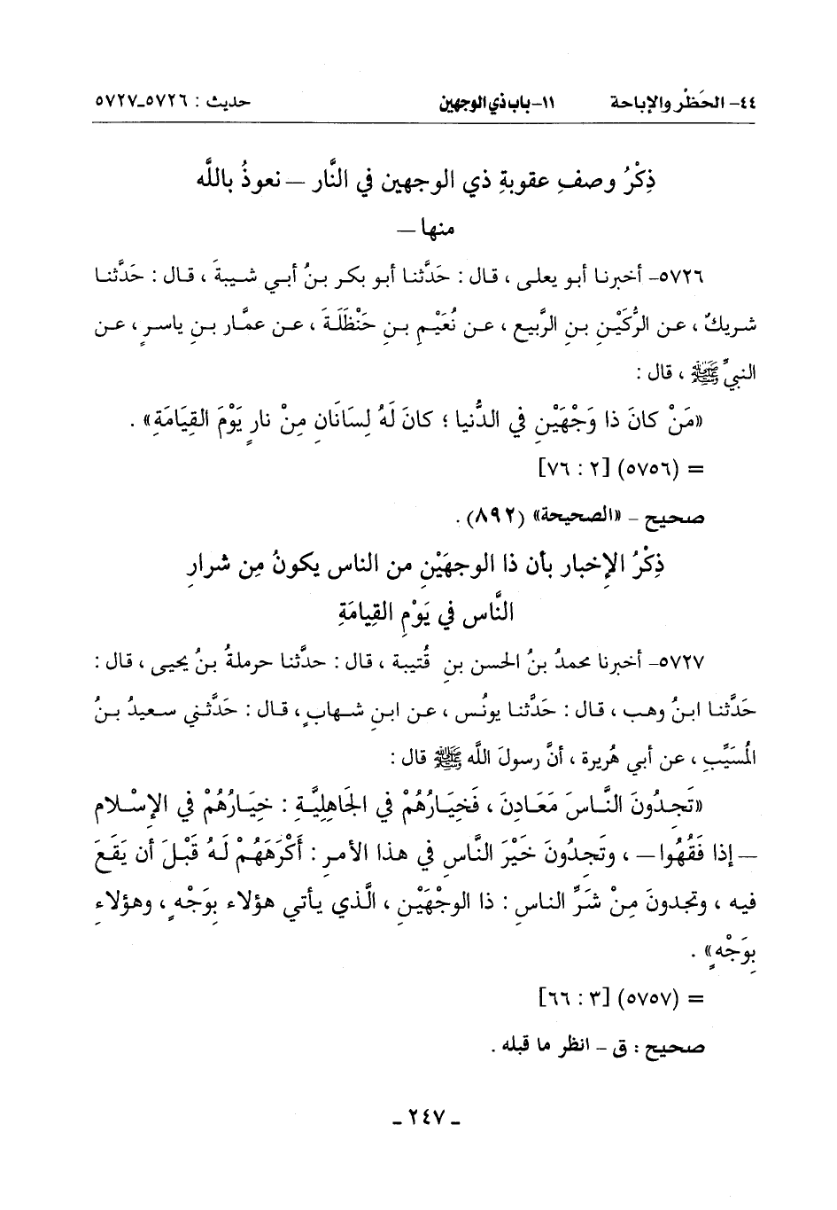 ((تَجِدُونَ النَّاسَ مَعَادِنَ , فَخِيَارُهُمْ فِي الْجَاهِلِيَّةِ: خِيَارُهُمْ فِي الْإِسْلَامِ - إِذَا فَقُهُوا - , وَتَجِدُونَ خَيْرَ النَّاسِ فِي هَذَا الْأَمْرِ: أكْرَهَهُم لَهُ قَبْلَ أَنْ يَقَعَ فِيهِ , وَتَجِدُونَ مِنْ شَرِّ النَّاسِ: ذَا الْوَجْهَيْنِ , الَّذِي يَأْتِي هَؤُلَاءِ بِوَجْهٍ , وهؤلاء بوجه)).