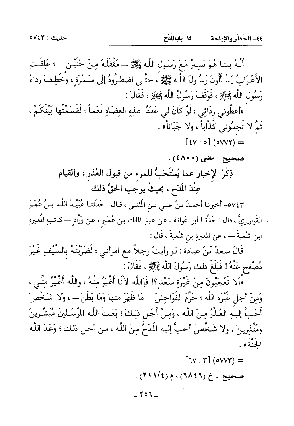 ((أَلَا تَعْجَبُونَ مِنْ غَيْرَةِ سَعْدٍ؟! فَوَاللَّهِ لَأَنَا أَغْيَرُ مِنْهُ , وَاللَّهُ أَغْيَرُ مِنِّي , وَمِنْ أَجْلِ غَيْرَةِ اللَّهِ؛ حَرَّمَ الْفَوَاحِشَ - مَا ظَهَرَ مِنْهَا وَمَا بَطَنَ - , وَلَا شَخْصَ أحبُّ إِلَيْهِ الْعُذْرُ مِنَ اللَّهِ , وَمِنْ أَجْلِ ذَلِكَ؛ بَعَثَ اللَّهُ الْمُرْسَلِينَ مُبَشِّرين ومُنذِرين , وَلَا شَخَصَ أَحَبُّ إِلَيْهِ الْمَدْحُ مِنَ اللَّهِ , مِنْ أَجْلِ ذَلِكَ؛ وعد الله الجنة)).