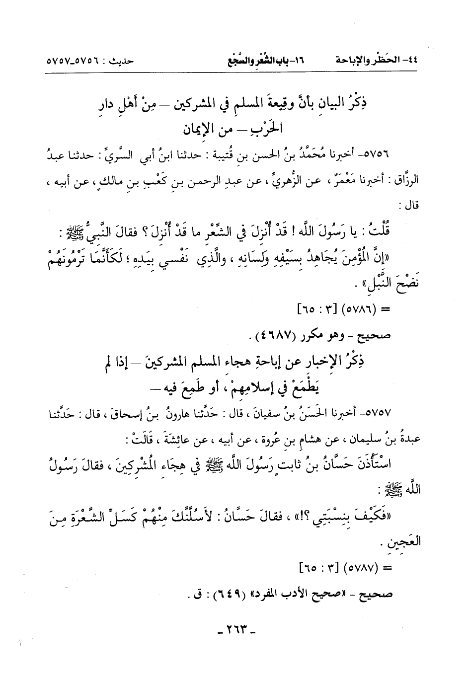 ذِكْرُ الْإِخْبَارِ عَنْ إِبَاحَةِ هِجَاءِ الْمُسْلِمِ الْمُشْرِكِينَ إِذَا لَمْ يَطْمَعْ فِي إِسْلَامِهِمْ أَوْ طَمِعَ فيه