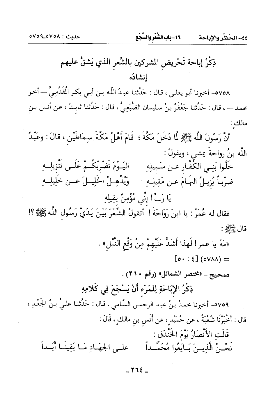 5759 - أَخْبَرَنَا مُحَمَّدُ بْنُ عَبْدِ الرَّحْمَنِ السَّامِيُّ , قَالَ: حَدَّثَنَا عَلِيُّ بْنُ الْجَعْدِ , قَالَ: أَخْبَرَنَا شُعْبَةُ عَنْ حُمَيْدٍ , عَنْ أَنَسِ بْنِ مَالِكٍ , قَالَ: