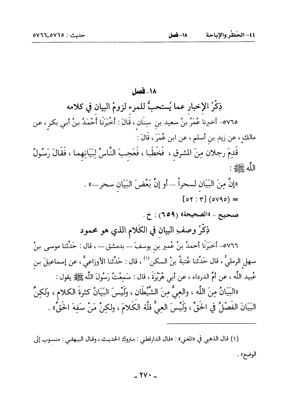 ((الْبَيَانُ مِنَ اللَّهِ , والعِيُّ مِنَ الشَّيْطَانِ , وَلَيْسَ الْبَيَانُ كَثْرَةَ الْكَلَامِ , وَلَكِنَّ الْبَيَانَ الْفَصْلُ فِي الْحَقِّ , وَلَيْسَ العِيُّ قِلَّةَ الْكَلَامِ , وَلَكِنْ مَنْ سَفِهَ الحق)). -[271]-