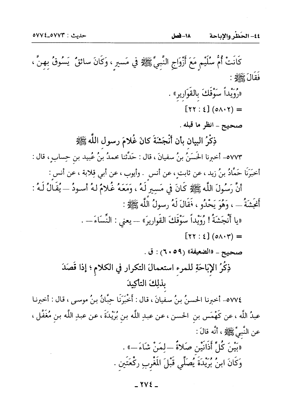 5773 - أَخْبَرَنَا الْحَسَنُ بْنُ سُفْيَانَ , قَالَ: حَدَّثَنَا مُحَمَّدُ بْنُ عُبَيْدِ بْنِ حِسَابٍ , قَالَ: أَخْبَرَنَا حَمَّادُ بْنُ زَيْدٍ , عَنْ ثَابِتٍ , عَنْ أَنَسِ. وَأَيُّوبَ , عَنْ أَبِي قِلَابَةَ , عَنْ أَنَسٍ: