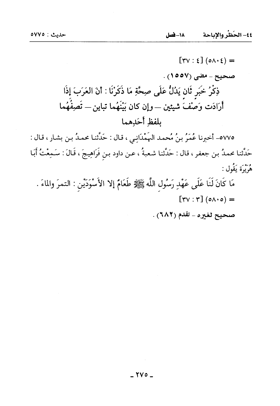 5775 - أَخْبَرَنَا عُمَرُ بْنُ مُحَمَّدٍ الْهَمْدَانِيُّ , قَالَ: حَدَّثَنَا مُحَمَّدُ بْنُ بَشَّارٍ , قَالَ: حَدَّثَنَا مُحَمَّدُ بْنُ جَعْفَرٍ , قَالَ: حَدَّثَنَا شُعْبَةُ , عَنْ دَاوُدَ بْنِ فَرَاهِيجَ , قَالَ: سَمِعْتُ أَبَا هُرَيْرَةَ يَقُولُ: