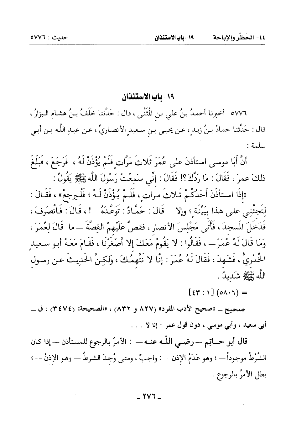 ((إِذَا اسْتَأْذَنَ أَحَدُكُمْ ثَلَاثَ مَرَّاتٍ , فَلَمْ يُؤذن لَهُ؛ فَلْيرجِعْ)) , فَقَالَ: لِتَجِئْنِي عَلَى هَذَا بِبَيِّنَةٍ؛ وَإِلَّا - قَالَ: حَمَّادٌ: تَوَعَّدَهُ -! , قَالَ: فَانْصَرَفَ , فَدَخَلَ الْمَسْجِدَ , فَأَتَى مَجْلِسَ الْأَنْصَارِ , فقصَّ عَلَيْهِمُ الْقِصَّةَ - مَا قَالَ لِعُمَرَ , وَمَا قَالَ لَهُ عُمَرُ - , فَقَالُوا: لَا يَقُومُ مَعَكَ إِلَّا أَصْغَرُنَا , فَقَامَ مَعَهُ أَبُو سَعِيدٍ الْخُدْرِيُّ , فَشَهِدَ , فَقَالَ لَهُ عُمَرُ: إِنَّا لَا نَتَّهِمُكَ , وَلَكِنَّ الْحَدِيثُ عَنْ رَسُولِ اللَّهِ صَلَّى اللَّهُ عَلَيْهِ وَسَلَّمَ شَدِيدٌ.