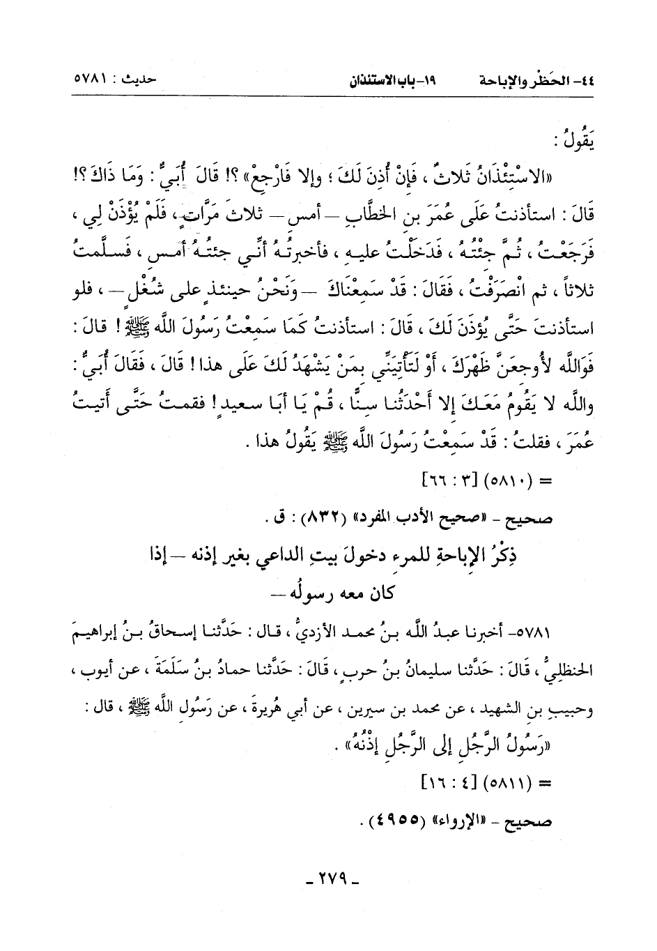 5781 - أَخْبَرَنَا عَبْدُ اللَّهِ بْنُ مُحَمَّدٍ الْأَزْدِيُّ , قَالَ: حَدَّثَنَا إِسْحَاقُ بْنُ إِبْرَاهِيمَ الْحَنْظَلِيُّ , قَالَ: حَدَّثَنَا سُلَيْمَانُ بْنُ حَرْبٍ , قَالَ: حَدَّثَنَا حَمَّادُ بْنُ سَلَمَةَ , عَنْ أَيُّوبَ , وَحَبِيبِ بْنِ الشَّهِيدِ , عَنْ مُحَمَّدِ بْنِ سِيرِينَ , عَنْ أَبِي هُرَيْرَةَ , عَنْ رَسُولِ اللَّهِ صَلَّى اللَّهُ عَلَيْهِ وَسَلَّمَ , قال: