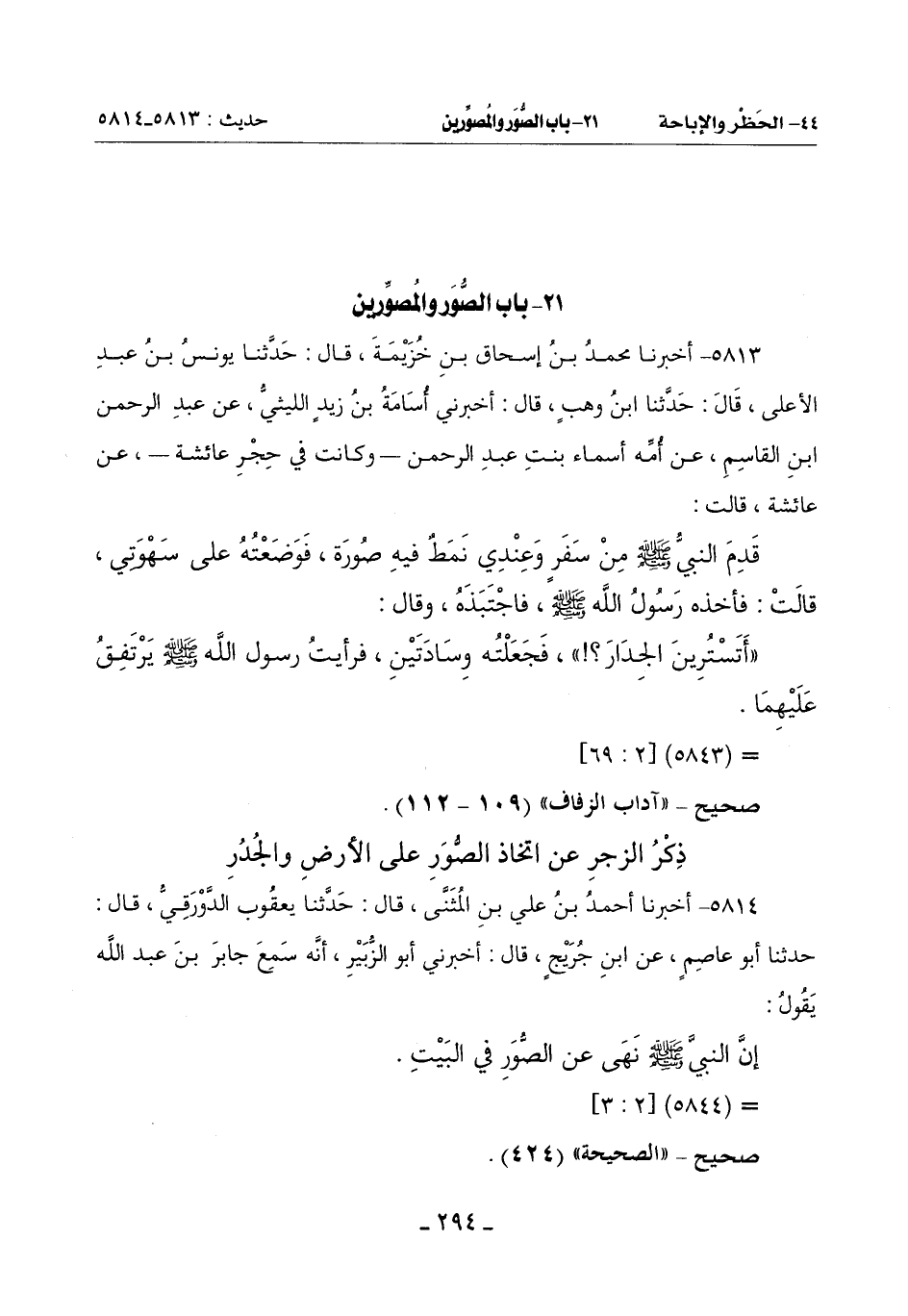 5813 - أَخْبَرَنَا مُحَمَّدُ بْنُ إِسْحَاقَ بْنِ خُزَيْمَةَ , قَالَ: حَدَّثَنَا يُونُسُ بْنُ عَبْدِ الْأَعْلَى , قَالَ: حَدَّثَنَا ابْنُ وَهْبٍ , قَالَ: أَخْبَرَنِي أُسَامَةُ بْنُ زَيْدٍ الليثي , عن عبد الرحمن ابن الْقَاسِمِ , عَنْ أُمِّهِ أَسْمَاءَ بِنْتِ عَبْدِ الرَّحْمَنِ - وَكَانَتْ فِي حِجْرِ عَائِشَةَ - , عَنْ عَائِشَةَ , قَالَتْ: