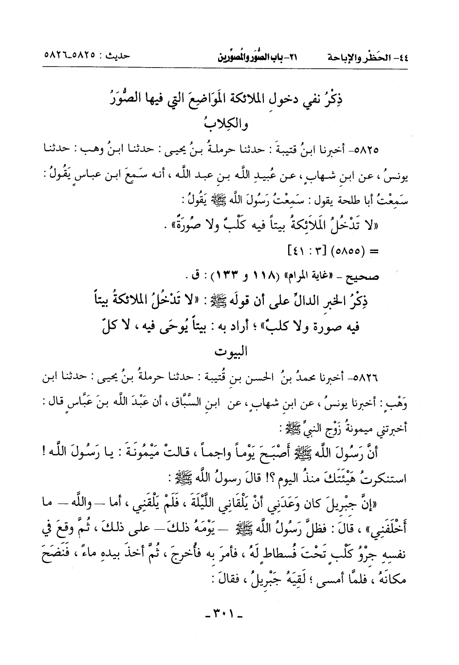 5825 - أَخْبَرَنَا ابْنُ قُتَيْبَةَ: حَدَّثَنَا حَرْمَلَةُ بْنُ يَحْيَى: حَدَّثَنَا ابْنُ وَهْبٍ: حَدَّثَنَا يُونُسُ , عَنِ ابْنِ شِهَابٍ , عَنْ عُبَيْدِ اللَّهِ بْنِ عَبْدِ اللَّهِ , أَنَّهُ سَمِعَ ابْنَ عَبَّاسٍ يَقُولُ: سَمِعْتُ أَبَا طَلْحَةَ يَقُولُ: سَمِعْتُ رَسُولَ اللَّهِ صَلَّى اللَّهُ عَلَيْهِ وَسَلَّمَ يَقُولُ: