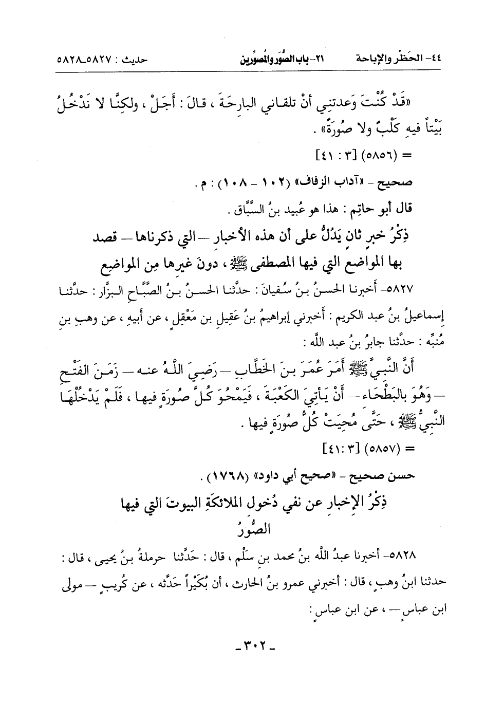 أَنَّ النَّبِيَّ صَلَّى الله عَلَيْهِ وَسَلَّمَ أَمَرَ عُمَرَ بْنِ الْخَطَّابِ - رَضِيَ اللَّهُ عَنْهُ - زَمَنَ الْفَتْحِ - وَهُوَ بِالْبَطْحَاءِ - أَنْ يَأْتِيَ الْكَعْبَةَ , فَيَمْحُوَ كُلَّ صُورَةٍ فِيهَا , فَلَمْ يَدْخُلْهَا النَّبِيُّ صَلَّى اللَّهُ عَلَيْهِ وَسَلَّمَ , حَتَّى مُحِيَتْ كل صورة فيها.