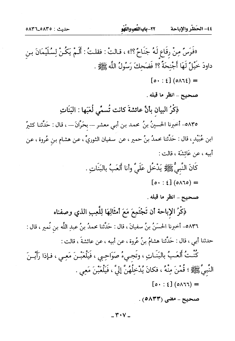 5836 - أَخْبَرَنَا الْحَسَنُ بْنُ سُفْيَانَ , قَالَ: حَدَّثَنَا مُحَمَّدُ بْنُ عَبْدِ اللَّهِ بْنِ نُمَيْرٍ , قَالَ: حَدَّثَنَا أَبِي , قَالَ: حَدَّثَنَا هِشَامُ بْنُ عُرْوَةَ , عَنْ أَبِيهِ: عَنْ عَائِشَةَ , قَالَتْ: