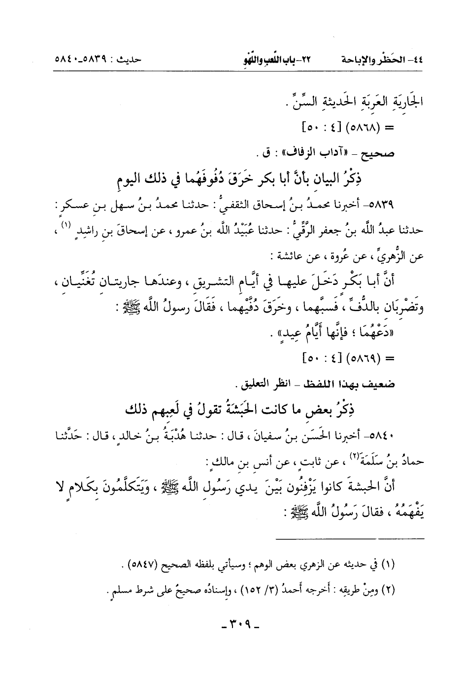 أَنَّ الْحَبَشَةَ كَانُوا يَزْفِنُون بَيْنَ يَدَيْ رَسُولِ اللَّهِ صَلَّى اللَّهُ عَلَيْهِ وَسَلَّمَ , وَيَتَكَلَّمُونَ بِكَلَامٍ لَا يَفْهَمْهُ , فَقَالَ رَسُولُ اللَّهِ صَلَّى اللَّهُ عَلَيْهِ وَسَلَّمَ: -[310]-