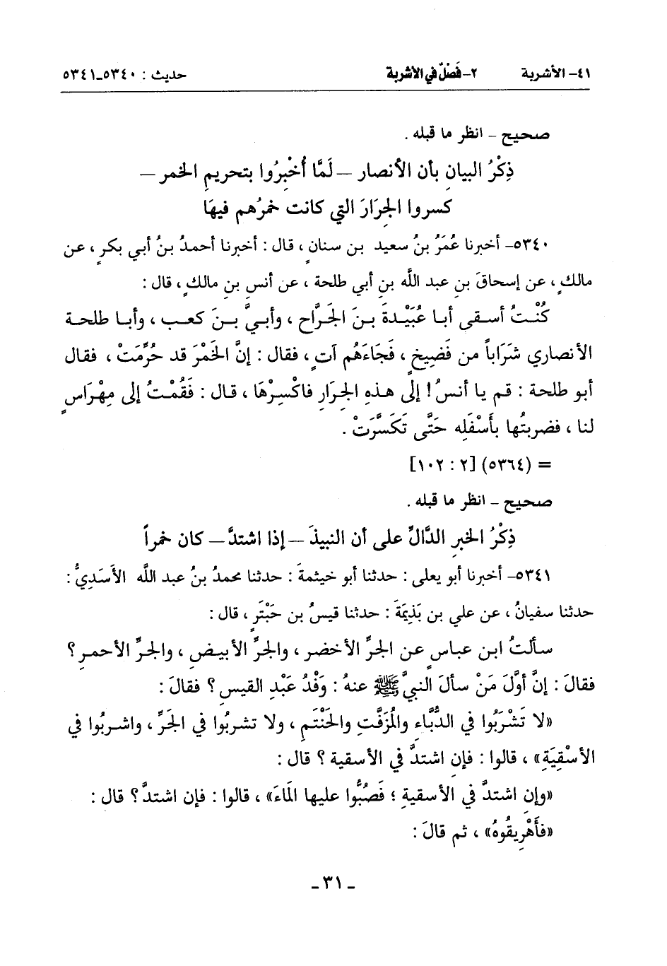 ((لَا تَشْرَبُوا فِي الدُّبَّاء والمزفِّت وَالْحَنْتَمِ، وَلَا تَشْرَبُوا فِي الجرِّ، وَاشْرَبُوا فِي الْأَسْقِيَةِ))، قَالُوا: فَإِنِ اشْتَدَّ فِي الْأَسْقِيَةِ؟ قَالَ: