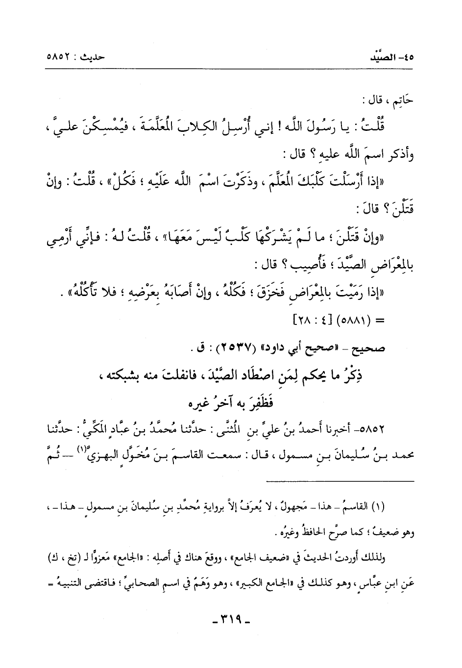 ولذلك أوردتُ الحديث في ((ضعيف الجامع)) , ووقع هناك في أصله: ((الجامع)) مَعزوًّا لـ (تخ , ك) عن ابن عباس , وهو كذلك في ((الجامع الكبير)) , وهو وَهَمٌ في اسم الصحابي؛ فاقتضى التنبيه عليه ثَمَّةَ؛ فإنَّهُ في ((تاريخ البخاري)) (4/ 2/30) , والحاكم (4/ 134) مِنَ الوجه المذكور هنا: من حديث مُخَوَّلٍ البهزي , لا ابن عباس.