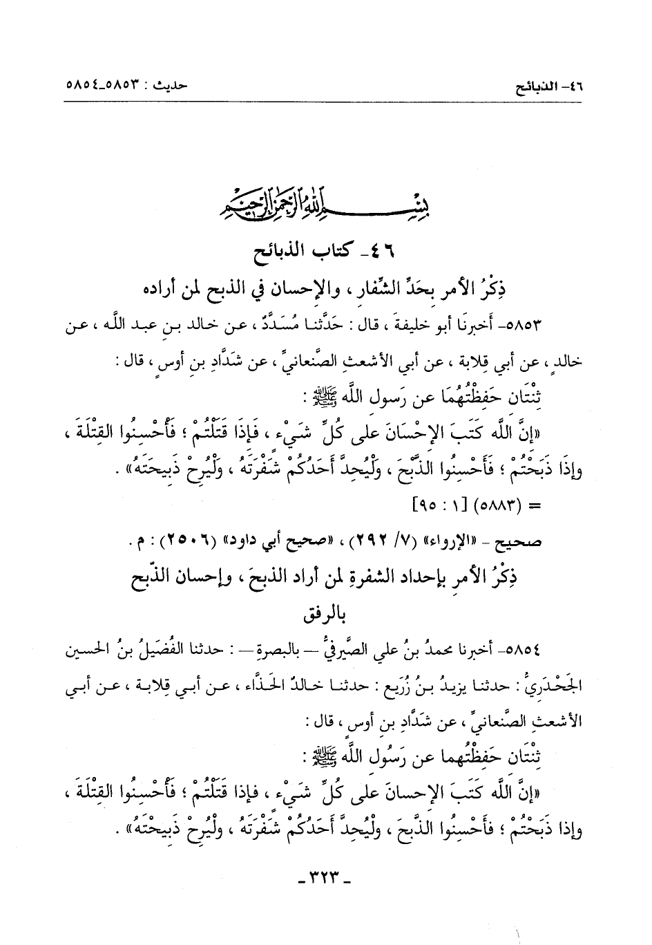 ((إِنَّ اللَّهَ كَتَبَ الْإِحْسَانَ عَلَى كُلِّ شَيْءٍ , فَإِذَا قَتَلْتُمْ؛ فأحسِنُوا القِتْلَةَ , وَإِذَا ذَبَحْتُمْ؛ فأَحْسِنُوا الذَّبحَ , ولْيُحِدَّ أَحَدُكُمْ شَفْرَتَهُ , ولْيُرِحْ ذَبِيحْتَهُ)). -[324]-