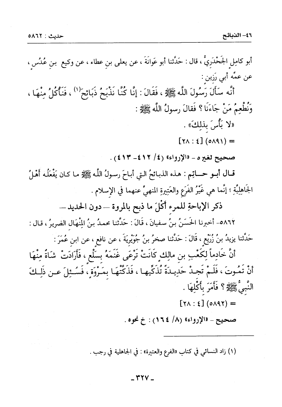 5862 - أَخْبَرَنَا الْحَسَنُ بْنُ سُفْيَانَ , قَالَ: حَدَّثَنَا مُحَمَّدُ بْنُ الْمِنْهَالِ الضَّرِيرُ , قَالَ: حَدَّثَنَا يَزِيدُ بْنُ زُرَيْعٍ , قَالَ: حَدَّثَنَا صَخْرُ بْنُ جُوَيْرِيَةَ , عَنْ نَافِعٍ , عَنِ ابْنِ عُمَرَ: