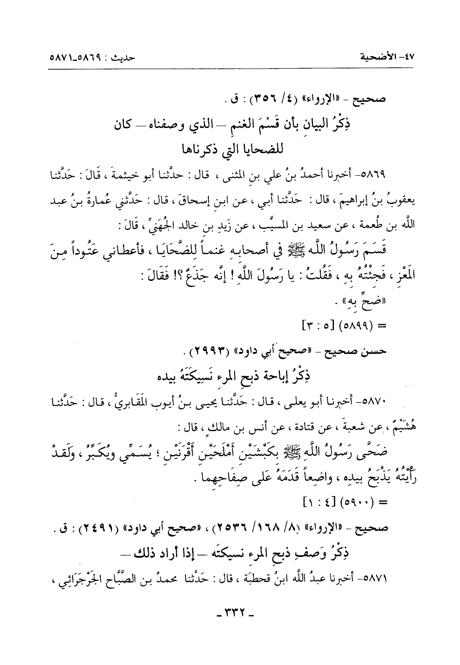 كَانَ رَسُولُ اللَّهِ صَلَّى اللَّهُ عَلَيْهِ وَسَلَّمَ يُضَحِّي بِكَبْشَيْنِ أَمْلَحَيْنِ أَقْرَنَيْنِ , وَكَانَ يُسَمِّي ويُكَبِّرُ , فَلَقَدْ رَأَيْتُهُ يَذْبَحُهُمَا بِيَدِهِ , واضعاً على صفاحهما قدمه.
