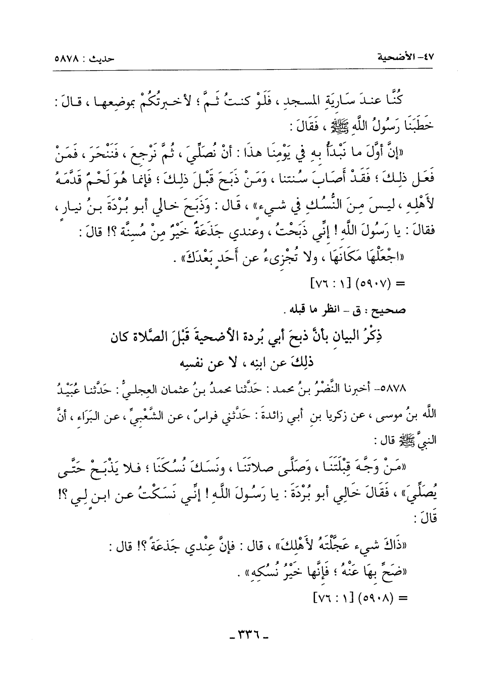 ((مَن وَجَّهَ قِبْلَتَنَا , وصَلَّى صَلَاتَنَا , ونَسَكَ نُسُكَنَا؛ فَلَا يَذْبَحْ حَتَّى يُصَلِّيَ)) , فَقَالَ خَالِي أَبُو بُرْدَةَ: يَا رَسُولَ اللَّهِ! إِنِّي نَسَكْتُ عَنِ ابنٍ لِي؟! قَالَ: