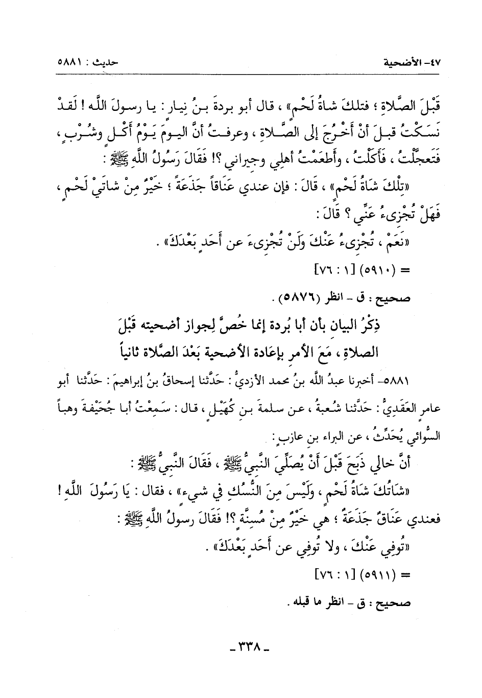 ذِكْرُ الْبَيَانِ بِأَنَّ أَبَا بُرْدَةَ إِنَّمَا خُصَّ لِجَوَازِ أُضْحِيَتِهِ قَبْلَ الصَّلَاةِ مَعَ الْأَمْرِ بِإِعَادَةِ الْأُضْحِيَّةِ بَعْدَ الصَّلَاةِ ثَانِيًا