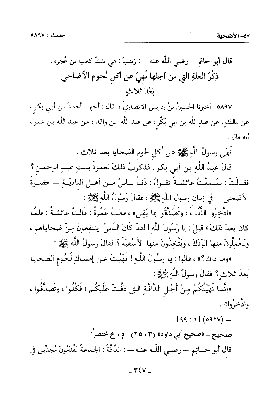 ((إِنَّمَا نَهَيْتُكُمْ مِنْ أَجْلِ الدَّافَّةِ الَّتِي دَفَّتْ عليكم؛ فَكُلُوا , وتَصَدَّقُوا , وادَّخِرُوا)).