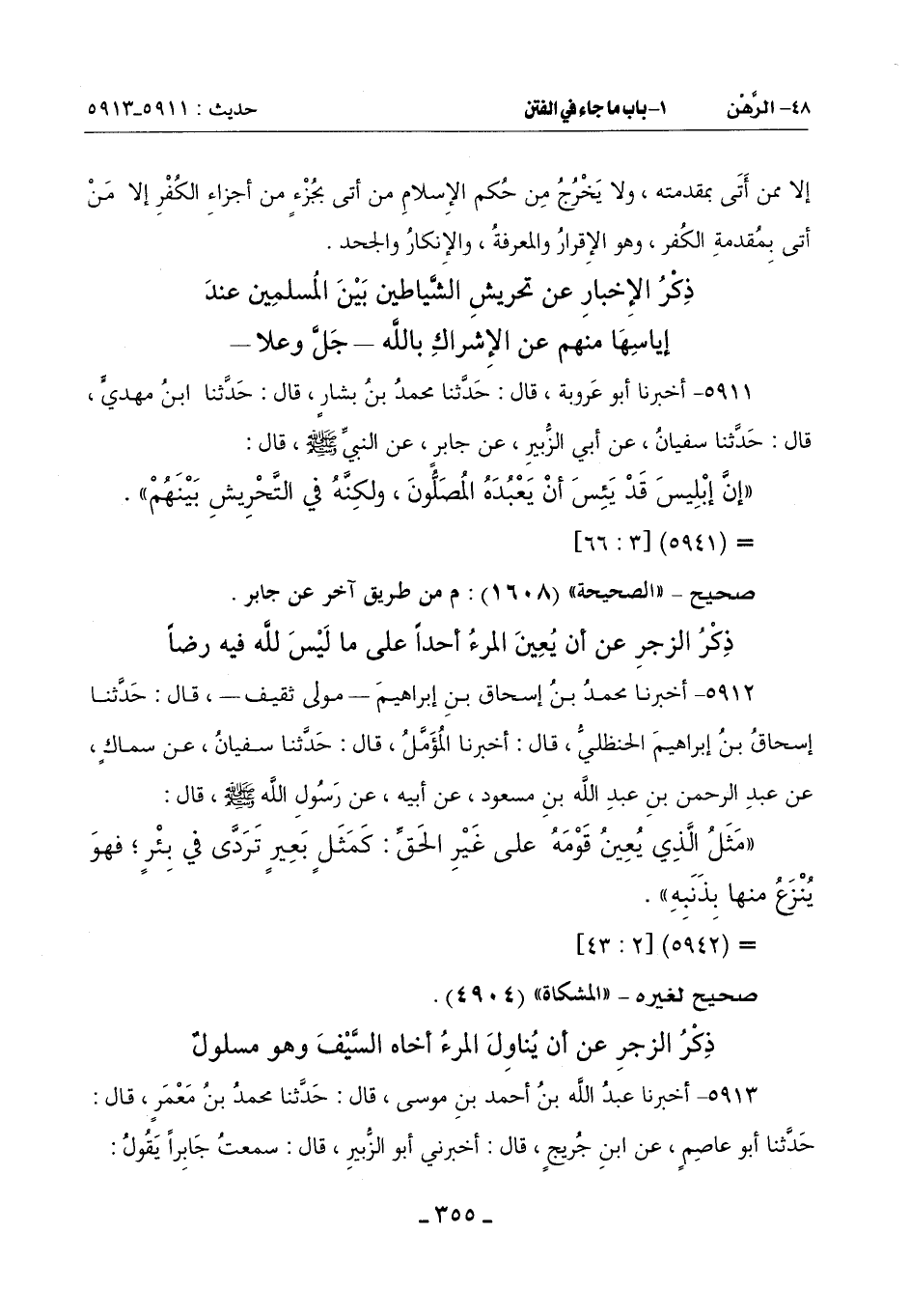 ذِكْرُ الْإِخْبَارِ عَنْ تَحْرِيشِ الشَّيَاطِينِ بَيْنَ الْمُسْلِمِينَ عِنْدَ إِيَاسِهَا مِنْهُمْ عَنِ الْإِشْرَاكِ بِاللَّهِ جَلَّ وعلا