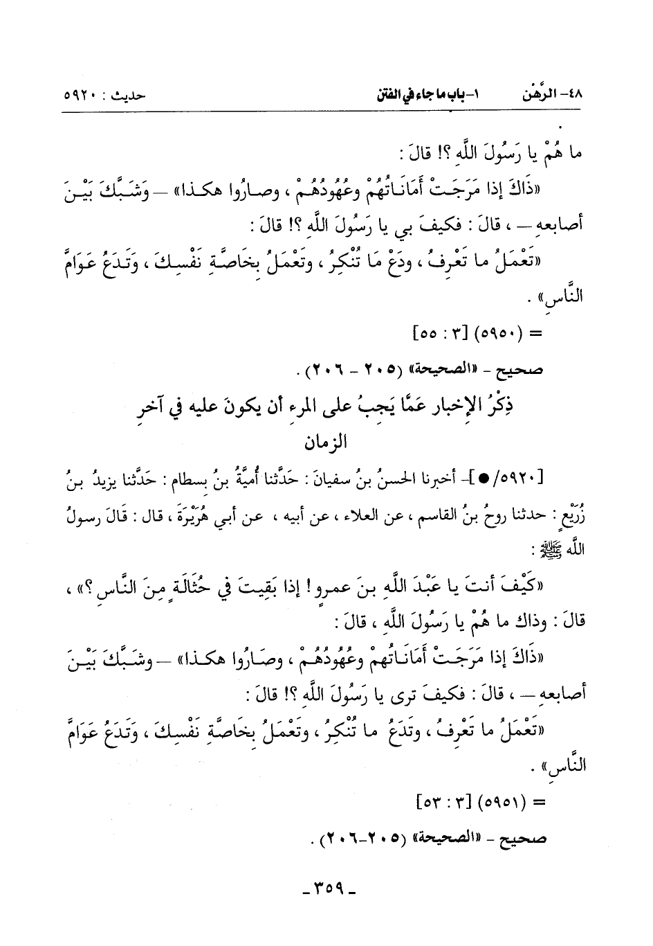 ذِكْرُ الْإِخْبَارِ عَمَّا يَجِبُ عَلَى الْمَرْءِ أَنْ يَكُونَ عَلَيْهِ فِي آخِرِ الزَّمَانِ