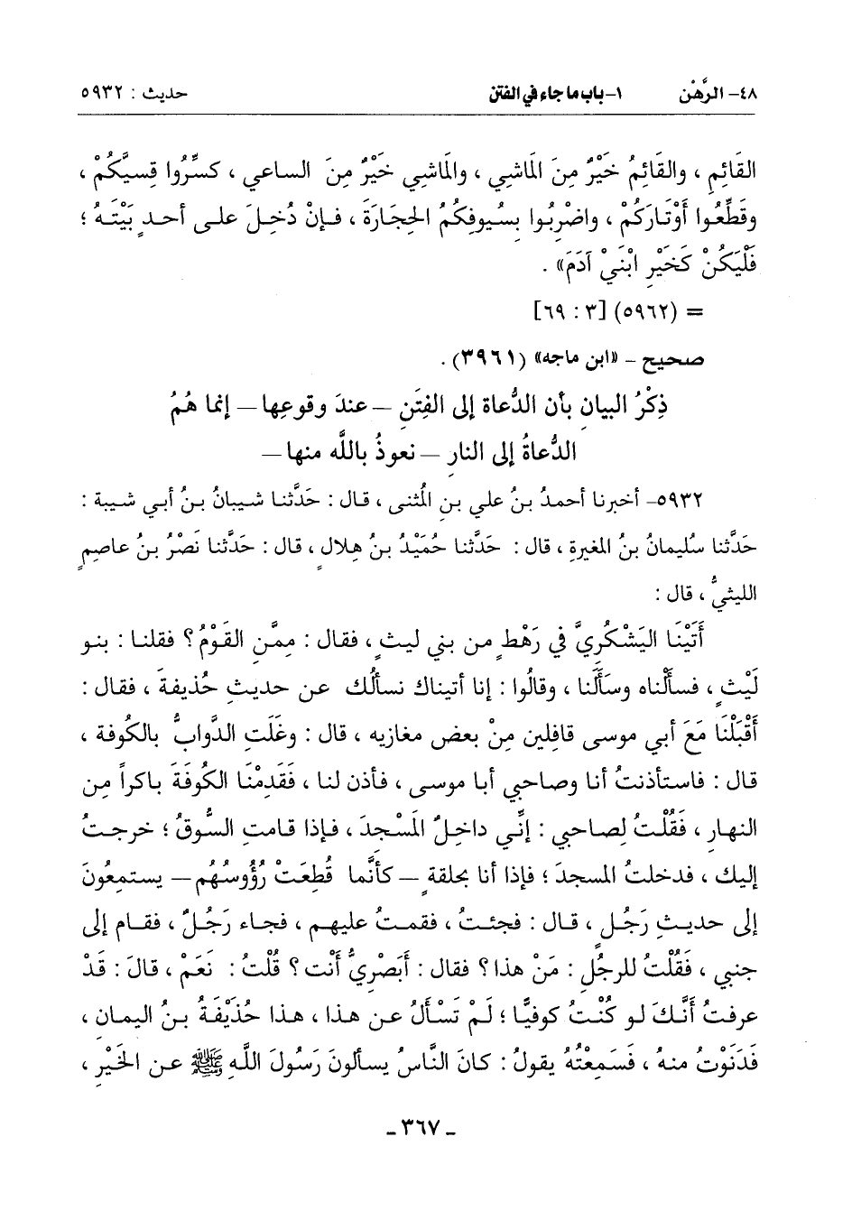 أَتَيْنَا الْيَشْكُرِيَّ فِي رَهْطٍ مِنْ بَنِي لَيْثٍ , فَقَالَ: مِمَّنِ الْقَوْمُ؟ فَقُلْنَا: بَنُو لَيْثٍ, فَسَأَلْنَاهُ وسَأَلَنا , وَقَالُوا: إِنَّا أَتَيْنَاكَ نسألُك عَنْ حَدِيثِ حُذَيْفَةَ , فَقَالَ: أَقْبَلْنَا مَعَ أَبِي مُوسَى قَافِلِينَ مِنْ بَعْضِ مَغَازِيهِ , قَالَ: وغَلَتِ الدَّوابُّ بِالْكُوفَةِ , قَالَ: فَاسْتَأْذَنْتُ أَنَا وَصَاحِبِي أَبَا مُوسَى , فَأَذِنَ لَنَا , فَقَدِمْنَا الْكُوفَةَ بَاكِرًا مِنَ النَّهَارِ , فَقُلْتُ لِصَاحِبِي: إِنِّي دَاخِلٌ الْمَسْجِدَ , فَإِذَا قَامَتِ السُّوقُ؛ خَرَجْتُ إِلَيْكَ , فَدَخَلْتُ الْمَسْجِدَ؛ فَإِذَا أَنَا بحلقة - كأنما قُطِعَتْ رؤوسهم - يَسْتَمِعُونَ إِلَى حَدِيثِ رَجُلٍ , قَالَ: فَجِئْتُ , فَقُمْتُ عَلَيْهِمْ , فَجَاءَ رَجُلٌ فَقَامَ إِلَى جَنْبِي , فَقُلْتُ لِلرَّجُلِ: مَنْ هَذَا؟ فَقَالَ: أَبَصْرِيُّ أَنْتَ؟ قُلْتُ: نَعَمْ , قَالَ: قَدْ عَرَفْتُ أَنَّكَ لَوْ كُنتَ كُوفِيًّا؛ لَمْ تَسْأَلْ عَنْ هَذَا , هَذَا حُذَيْفَةُ بْنُ الْيَمَانِ , فَدَنَوْتُ مِنْهُ , فَسَمِعْتُهُ يَقُولُ: كَانَ النَّاسُ يَسْأَلُونَ رَسُولَ اللَّهِ صَلَّى اللَّهُ عَلَيْهِ وَسَلَّمَ عَنِ الْخَيْرِ , -[368]- وَكُنْتُ أَسْأَلُهُ عَنِ الشَّرِّ , وعَرَفْتُ أَنَّ الْخَيْرَ لَمْ يَسْبِقْني , فَقُلْتُ: يَا رَسُولَ اللَّهِ! هَلْ بَعْدَ هَذَا الْخَيْرِ مِنْ شَرٍّ؟! فَقَالَ: