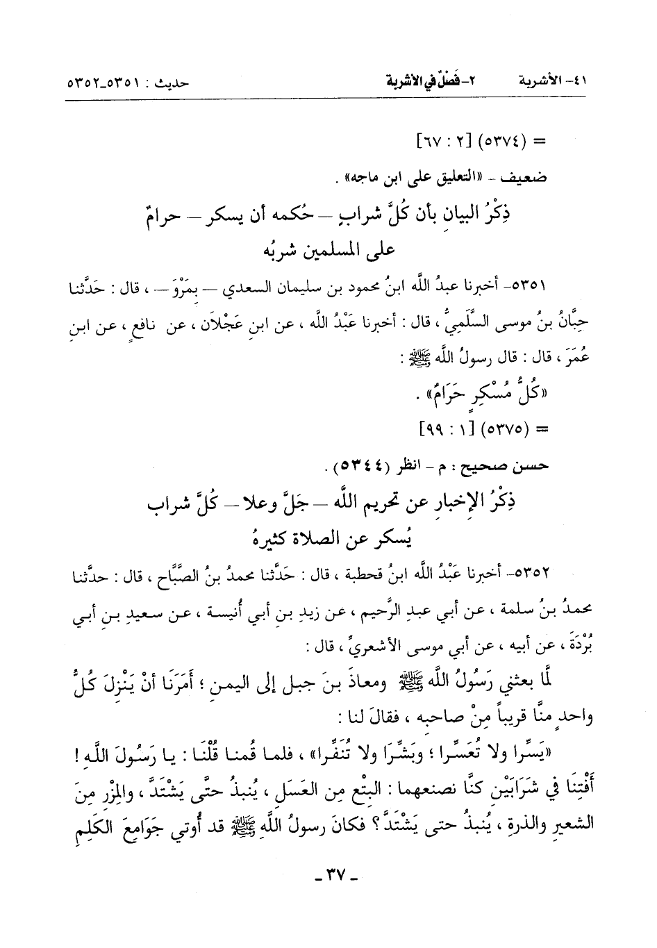 ((حَرَامٌ عَلَيْكُمْ كُلُّ مُسْكِرٍ يُسكر عَنِ الصَّلَاةِ))، قَالَ: وَأَتَانِي مُعَاذٌ يَوْمًا ـ وَعِنْدِي رَجُلٌ كَانَ يَهُودِيًّا فَأَسْلَمَ، ثُمَّ تهوَّد -، فَسَأَلَنِي: مَا شَأْنُهُ؟ فَأَخْبَرْتُهُ، فَقُلْتُ لِمُعَاذٍ: اجْلِسْ، فَقَالَ: مَا أَنَا بِالَّذِي أَجْلِسُ حَتَّى أَعْرِضَ عَلَيْهِ الْإِسْلَامَ، فَإِنْ قَبِلَ؛ وَإِلَّا ضَرَبْتُ عُنُقَهُ، فَعَرَضَ عَلَيْهِ الْإِسْلَامَ، فَأَبَى أَنْ يُسْلِم، فَضَرَبَ عُنُقَهُ فَسَأَلَنِي مُعَاذٌ يَوْمًا: كَيْفَ تَقْرَأُ الْقُرْآنَ؟ فَقُلْتُ: أقرأه قَائِمًا وَقَاعِدًا، وَعَلَى فِرَاشِي؛ أتفوَّقُهُ تَفَوُّقًا، قَالَ: وَسَأَلْتُ مُعَاذًا: كَيْفَ تَقْرَأُ أَنْتَ؟ قَالَ: أَقْرَأُ، وَأَنَامُ، ثُمَّ أَقُومُ، فَأَتَقَوَّى بِنَوْمَتِي عَلَى قَوْمَتِي، ثُمَّ أَحْتَسِبُ نَوْمَتِي بِمَا أَحْتَسِبُ بِهِ قَوْمَتِي.