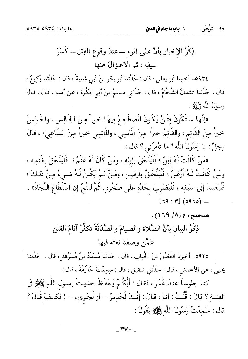 ذِكْرُ الْإِخْبَارِ بِأَنَّ عَلَى الْمَرْءِ ـ عِنْدَ وُقُوعِ الْفِتَنِ ـ كَسْرَ سَيْفِهِ ثُمَّ الِاعْتِزَالَ عَنْهَا
