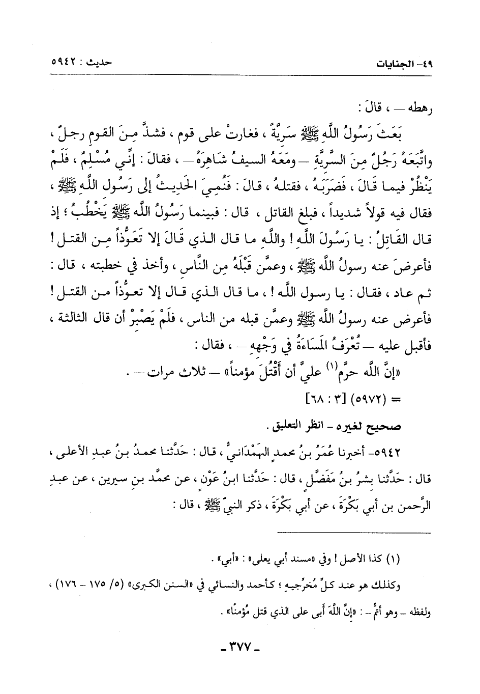 5942 - أَخْبَرَنَا عُمَرُ بْنُ مُحَمَّدٍ الْهَمْدَانِيُّ , قَالَ: حَدَّثَنَا مُحَمَّدُ بْنُ عَبْدِ الْأَعْلَى , قَالَ: حَدَّثَنَا بِشْرُ بْنُ مُفَضَّلٍ , قَالَ: حَدَّثَنَا ابْنُ عَوْنٍ , عَنْ مُحَمَّدِ بْنِ سِيرِينَ , عَنْ عَبْدِ الرَّحْمَنِ بْنِ أَبِي بَكْرَةَ , عَنْ أَبِي بَكْرَةَ , ذَكَرَ النَّبِيُّ صَلَّى اللَّهُ عَلَيْهِ وَسَلَّمَ , قَالَ: -[378]-