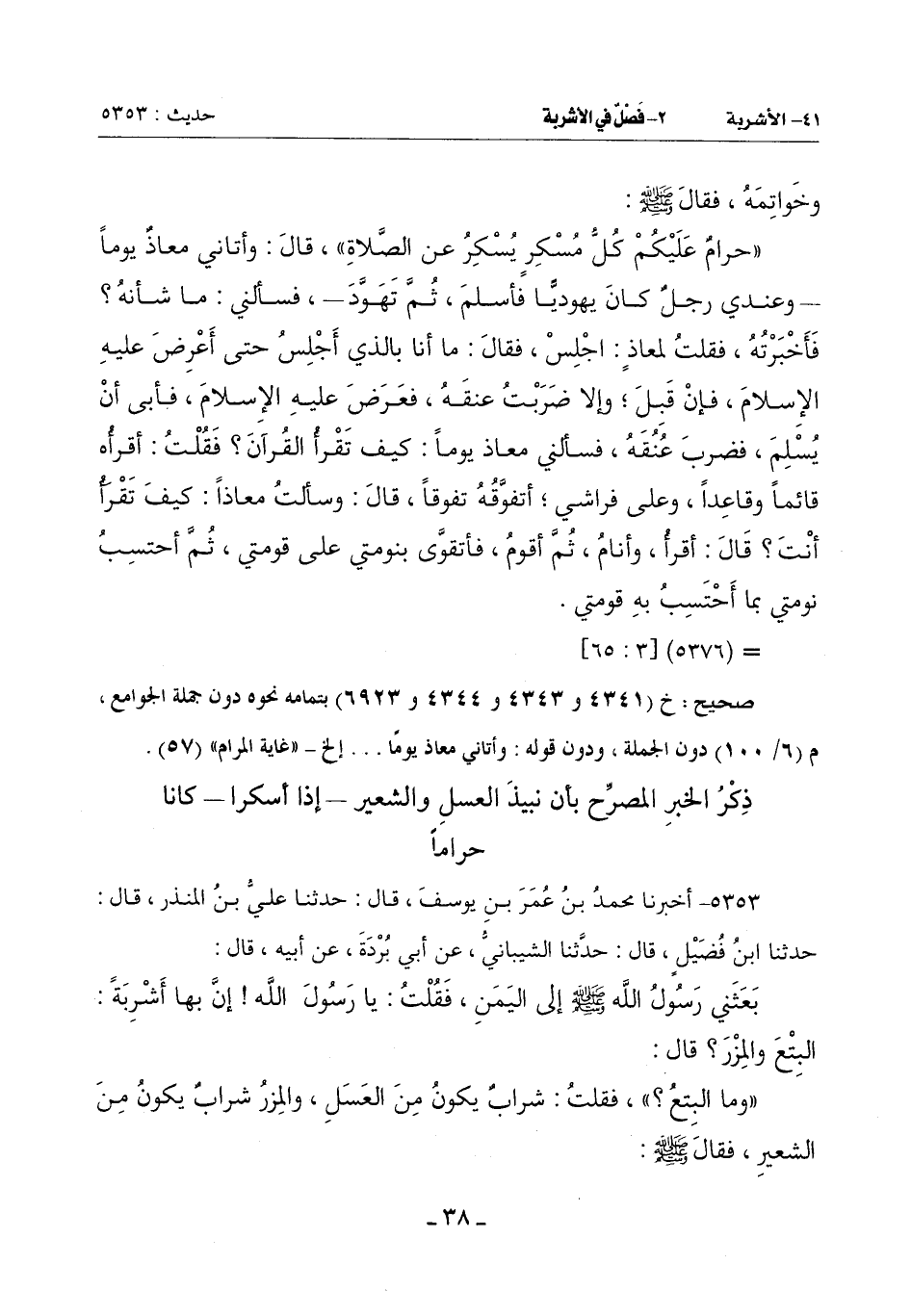 ((وَمَا الْبِتْعُ؟ ))، فَقُلْتُ: شَرَابٌ يَكُونُ مِنَ الْعَسَلِ، وَالْمِزْرُ شَرَابٌ يَكُونُ مِنَ الشَّعِيرِ، فَقَالَ صَلَّى اللَّهُ عَلَيْهِ وَسَلَّمَ: -[39]-