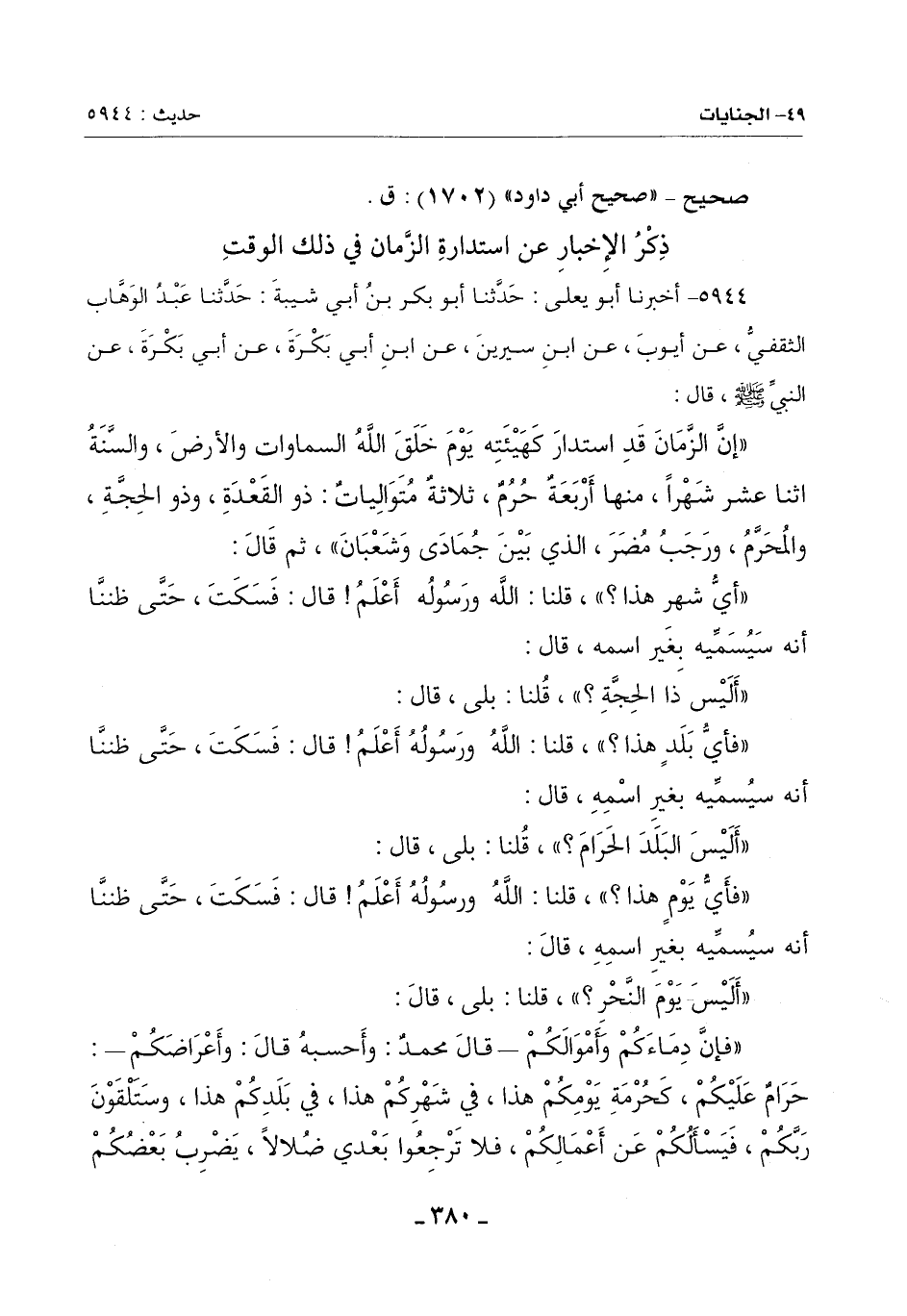 ((إِنَّ الزَّمَانَ قَدِ اسْتَدَارَ كَهَيْئَتِهِ يَوْمَ خَلَقَ اللَّهُ السَّمَاوَاتِ وَالْأَرْضَ , وَالسُّنَّةُ اثْنَا عَشَرَ شَهْرًا , مِنْهَا أَرْبَعَةٌ حُرُمٌ , ثَلَاثَةٌ مُتَوَالِيَاتٌ: ذُو الْقَعْدَةِ , وَذُو الْحِجَّةِ , والمُحَرَّمُ , وَرَجَبُ مُضَرَ , الَّذِي بَيْنَ جُمَادَى وَشَعْبَانَ)) , ثُمَّ قَالَ: