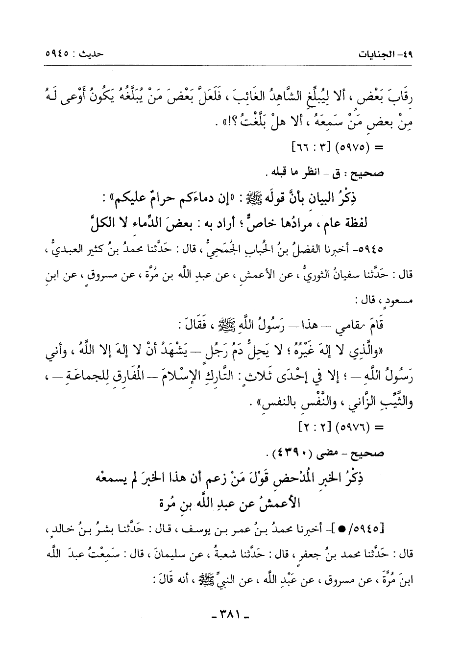 [5945/*]- أَخْبَرَنَا مُحَمَّدُ بْنُ عُمَرَ بْنِ يُوسُفَ , قَالَ: حَدَّثَنَا بِشْرُ بْنُ خَالِدٍ , قَالَ: حَدَّثَنَا مُحَمَّدُ بْنُ جَعْفَرٍ , قَالَ: حَدَّثَنَا شُعْبَةُ , عَنْ سُلَيْمَانَ , قَالَ: سَمِعْتُ عبد الله ابن مُرَّةَ , عَنْ مَسْرُوقٍ , عَنْ عَبْدِ اللَّهِ , عَنِ النَّبِيِّ صَلَّى اللَّهُ عَلَيْهِ وَسَلَّمَ , أَنَّهُ قَالَ: -[382]-