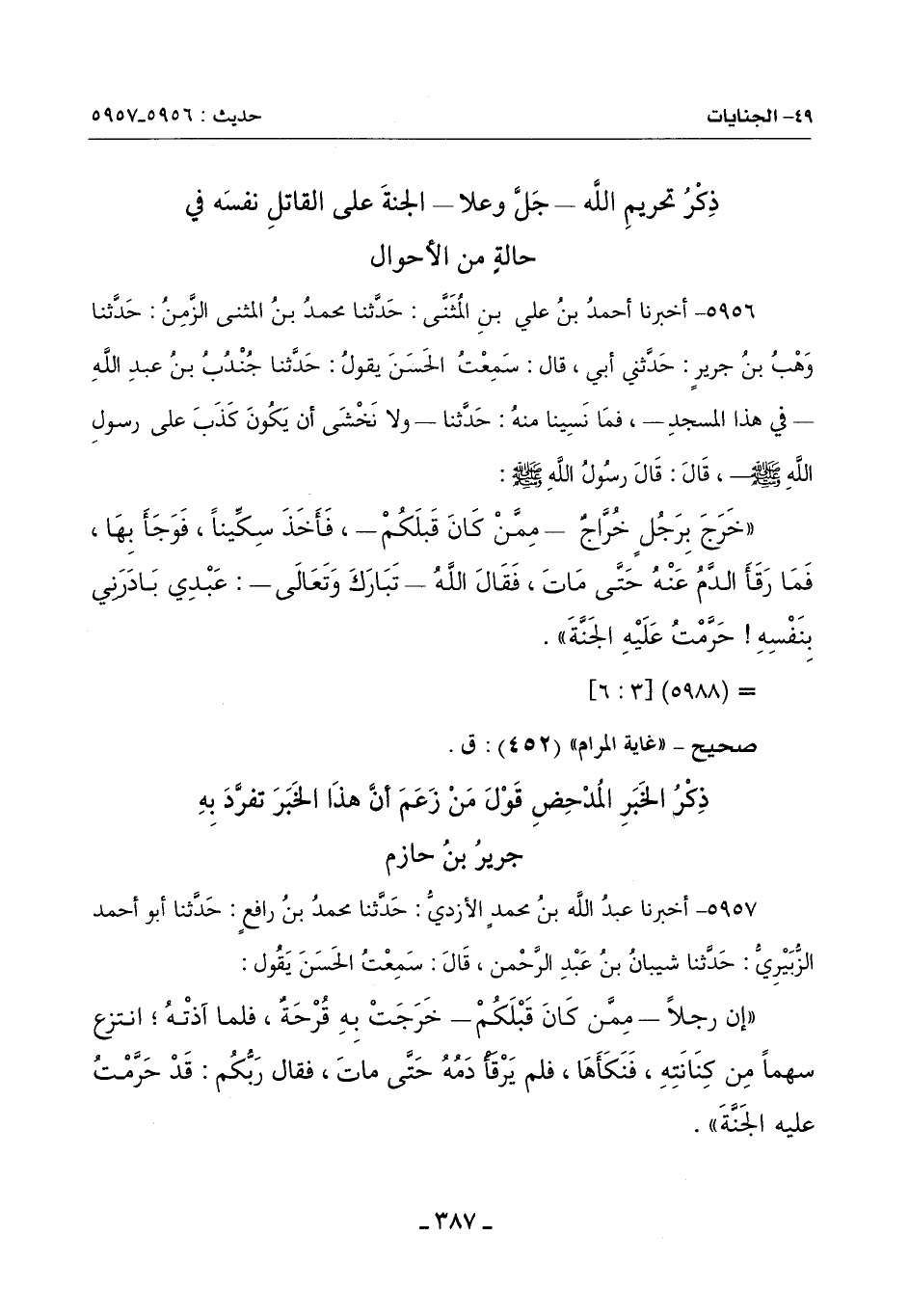 5956 - أَخْبَرَنَا أَحْمَدُ بْنُ عَلِيِّ بْنِ الْمُثَنَّى: حَدَّثَنَا مُحَمَّدُ بْنُ الْمُثَنَّى الزَّمِنُ: حَدَّثَنَا وَهْبُ بْنُ جَرِيرٍ: حَدَّثَنِي أَبِي , قَالَ: سَمِعْتُ الْحَسَنَ يَقُولُ: حَدَّثَنَا جُنْدُبُ بْنُ عَبْدِ اللَّهِ - فِي هَذَا الْمَسْجِدِ - , فَمَا نَسِينَا مِنْهُ: حَدَّثنا - وَلَا نَخْشَى أَنْ يَكُونَ كَذَبَ عَلَى رَسُولِ اللَّهِ صَلَّى اللَّهُ عَلَيْهِ وَسَلَّمَ - , قَالَ: قَالَ رَسُولُ اللَّهِ صَلَّى اللَّهُ عَلَيْهِ وَسَلَّمَ: