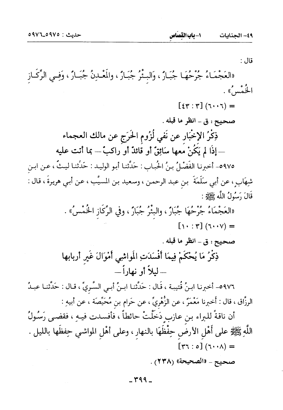 (العَجْمَاءُ جُرْحُهَا جُبَارٌ والبئرُ جُبَارٌ وفي الرِّكَازِ الخُمْسُ)