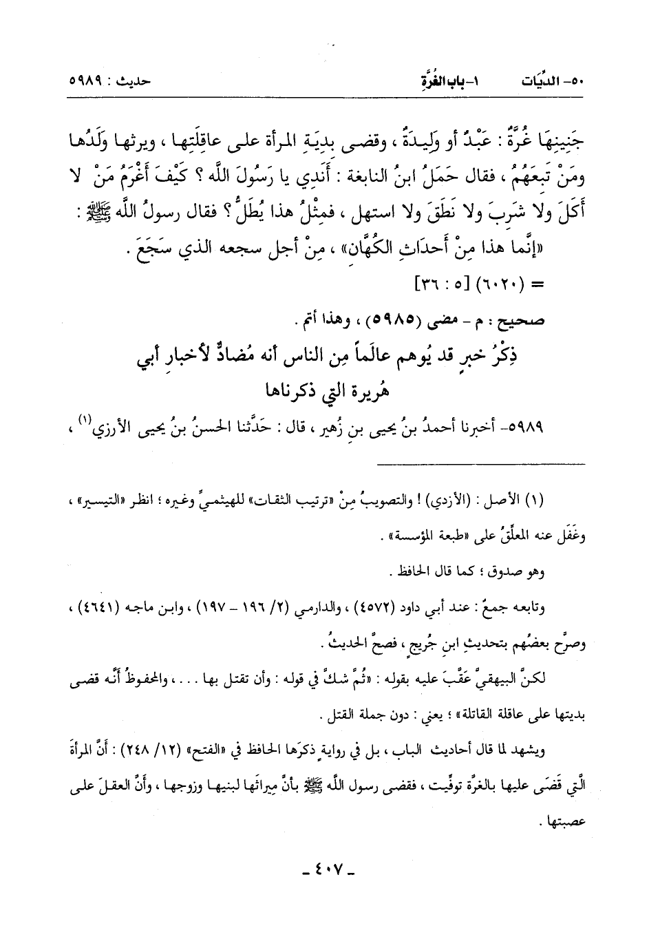 ويشهد لما قال أحاديث الباب , بل في روايةٍ ذكرها الحافظ في ((الفتح)) (12/ 248): أن المرأة التي قَضَى عليها بالغرَّة توفِّيت , فقضى رسول الله - صلى الله عليه وسلم - بأن مِيراثَها لبنيها وزوجها , وأن العقل على عصبتها.