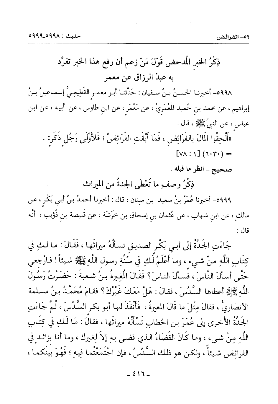 5999 - أَخْبَرَنَا عُمَرُ بْنُ سَعِيدِ بْنِ سِنَانٍ قَالَ: أَخْبَرَنَا أَحْمَدُ بْنُ أَبِي بَكْرٍ عَنْ مَالِكٍ عَنِ ابْنِ شِهَابٍ عَنْ عُثْمَانَ بْنِ إِسْحَاقَ بْنِ خَرَشَةَ: عَنْ قَبِيصَةَ بْنِ ذُؤَيْبٍ أَنَّهُ قَالَ: