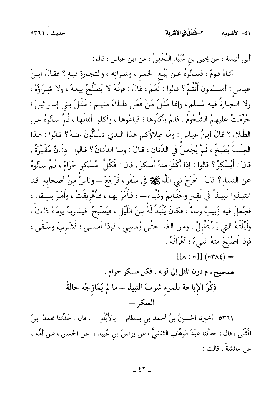 5361 - أَخْبَرَنَا الْحُسَيْنُ بْنُ أَحْمَدَ بْنِ بِسْطَامٍ - بِالْأُبُلَّةِ-، قَالَ: حَدَّثَنَا مُحَمَّدُ بْنُ الْمُثَنَّى، قَالَ: حَدَّثَنَا عَبْدُ الْوَهَّابِ الثَّقَفِيُّ، عَنْ يُونُسَ بْنِ عُبَيْدٍ، عَنِ الْحَسَنِ، عَنْ أُمِّهِ، عَنْ عَائِشَةَ، قَالَتْ: -[43]-