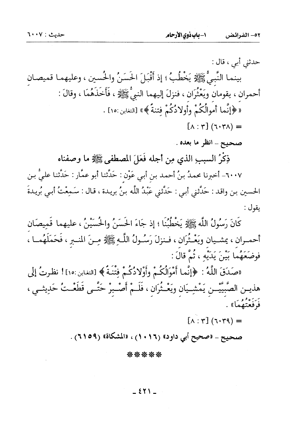 كَانَ رَسُولُ اللَّهِ صَلَّى اللَّهُ عَلَيْهِ وَسَلَّمَ يَخْطُبُنَا إِذْ جَاءَ الْحَسَنُ وَالْحُسَيْنُ عَلَيْهِمَا قَمِيصَانِ أَحْمَرَانِ يَمْشِيَانِ ويعثُران فَنَزَلَ رَسُولُ اللَّهِ صَلَّى اللَّهُ عَلَيْهِ وَسَلَّمَ مِنَ الْمِنْبَرِ فَحَمَلَهُمَا فَوَضَعَهُمَا بَيْنَ يَدَيْهِ ثُمَّ قَالَ: