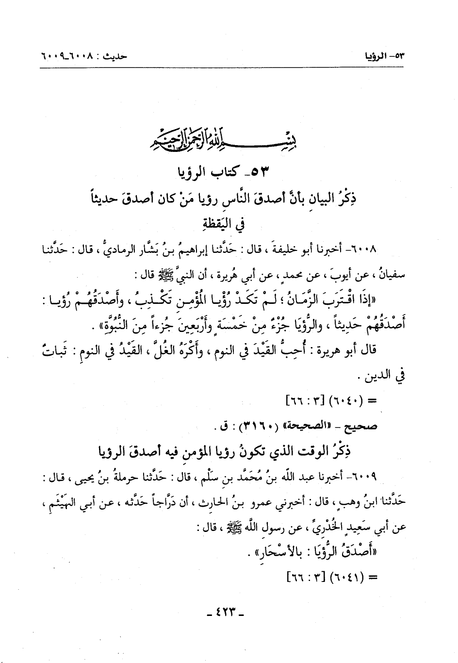 (إِذَا اقْتَرَبَ الزَّمَانُ لَمْ تَكَدْ رُؤْيَا الْمُؤْمِنِ تَكْذِبُ وَأَصْدَقُهُمْ رُؤْيَا أَصْدَقُهُمْ حَدِيثًا وَالرُّؤْيَا جُزْءٌ مِنْ خَمْسَةٍ وَأَرْبَعِينَ جُزْءًا مِنَ النُّبُوَّةِ)