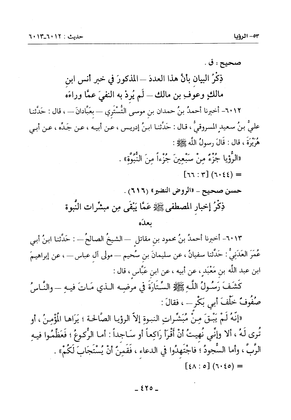 (إِنَّهُ لَمْ يَبْقَ مِنْ مُبَشِّرات النُّبُوَّةِ إِلَّا الرُّؤْيَا الصَّالِحَةُ يراها المؤمن أوتُرى لَهُ أَلَا وَإِنِّي نُهِيتُ أَنْ أَقْرَأَ رَاكِعًا أَوْ سَاجِدًا أَمَّا الرُّكُوعُ فَعَظِّمُوا فِيهِ الرَّبَّ وَأَمَّا السُّجُودُ فَاجْتَهِدُوا فِي الدُّعَاءِ فَقَمِنٌ أَنْ يُستجاب لكم)